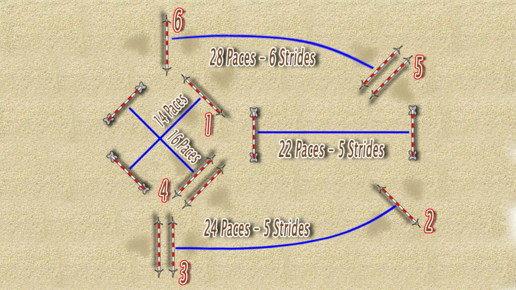 • Measure 24 paces, which rides down as 5 strides.