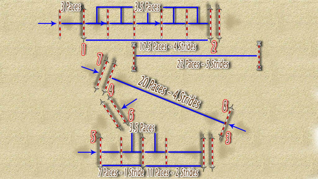 Finally, just below the first line along the top side, squeeze in a line of two cavalettis with a five-stride related distance, walking out at 22 paces.