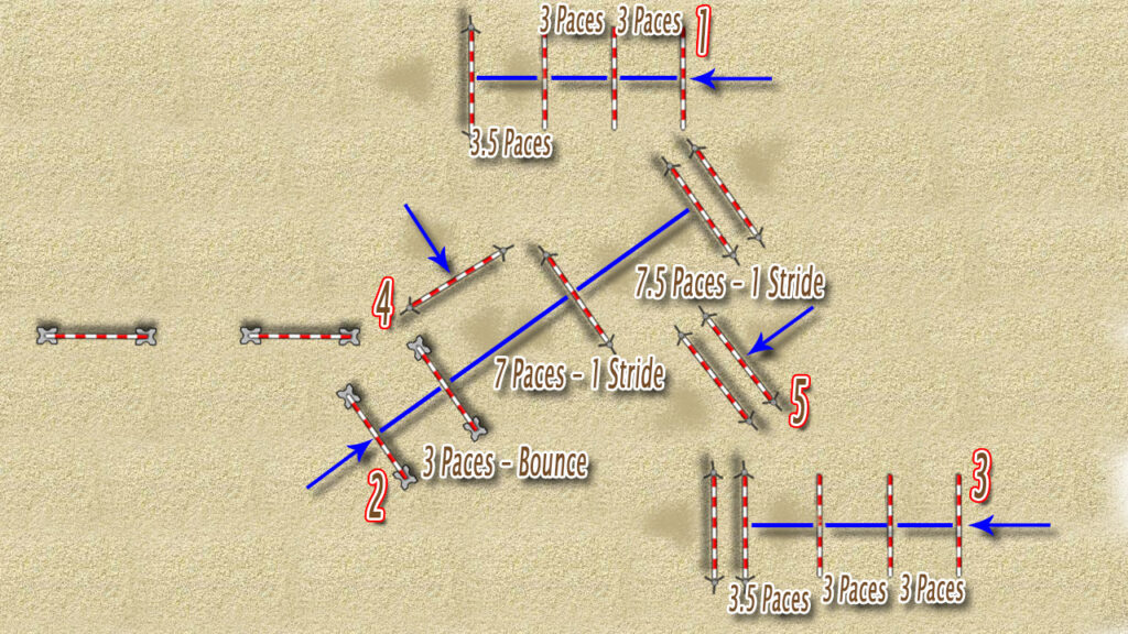 • 3.5 paces from the jump to the first canter pole,